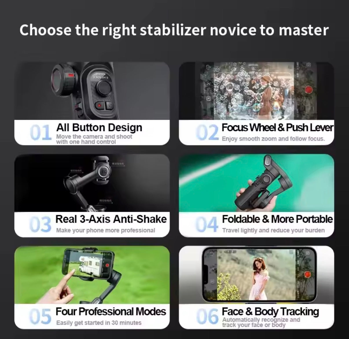 Lleva tus vídeos al siguiente nivel con el estabilizador portátil SmartXE de 3 ejes, diseñado para smartphones (iPhone y Android). Perfecto para creadores de contenido, vloggers, influencers de TikTok, transmisiones en vivo y capturar momentos diarios con fluidez profesional.