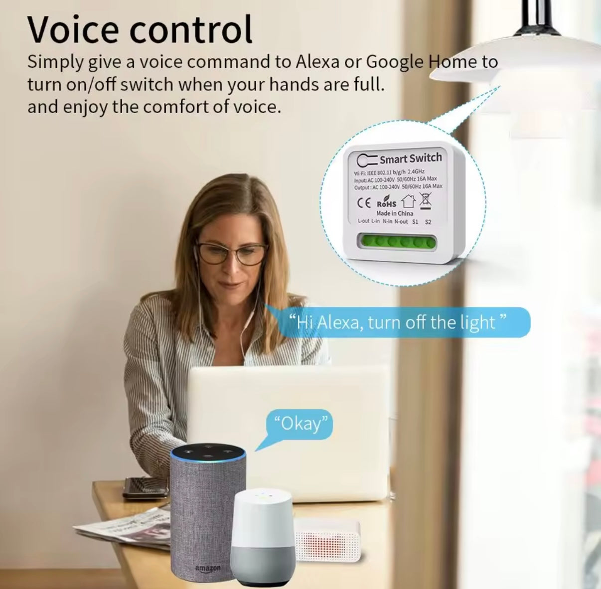 Convierte tu casa en un espacio inteligente con este interruptor WiFi de 16A compatible con Alexa, Google Assistant y la app Smart Life/Tuya. Diseñado para una instalación sencilla, te permite encender y apagar luces, electrodomésticos o cualquier dispositivo conectado directamente desde tu smartphone, sin importar dónde estés.