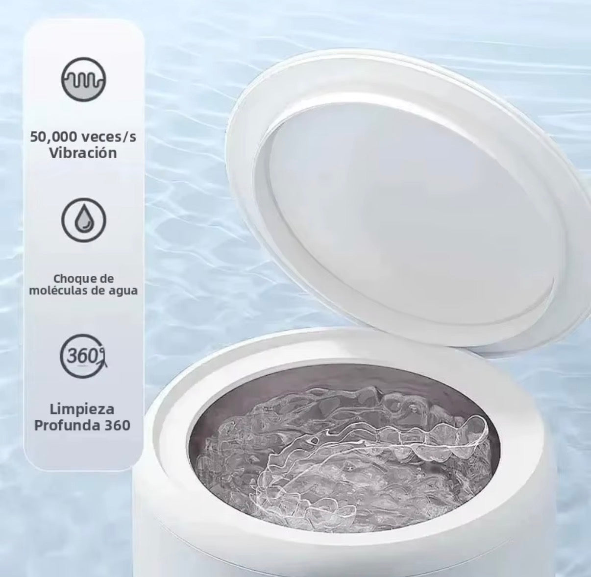Limpiador ultrasónico 50KHz ideal para aparatos ortopédicos, retenedores, joyas y dentaduras. Multifunción, portátil y recargable por USB para una limpieza profunda.