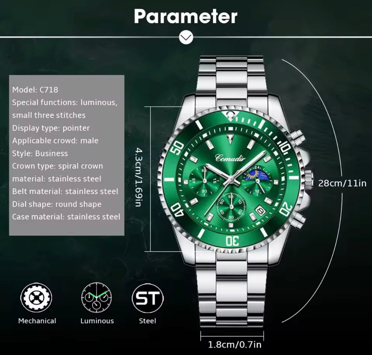 Eleva tu estilo con este elegante reloj cronógrafo de acero inoxidable para hombre. Diseñado para combinar funcionalidad y sofisticación, este reloj es perfecto tanto para la oficina como para tus actividades deportivas.